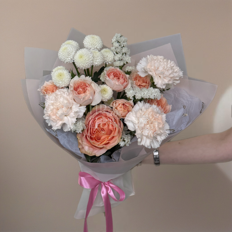 Аккуратный сборный букет, напоминает о нежном утреннем солнце. Подойдет в виде презента на дружеской встрече, или как дополнительный подарок к поздравлению.