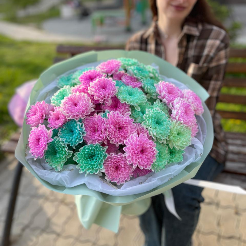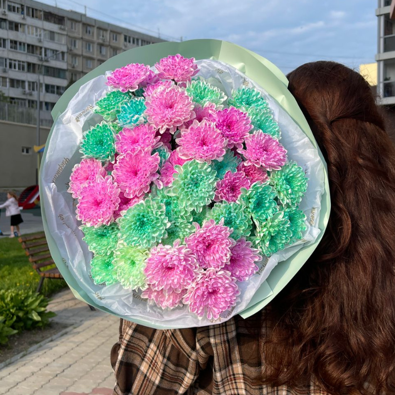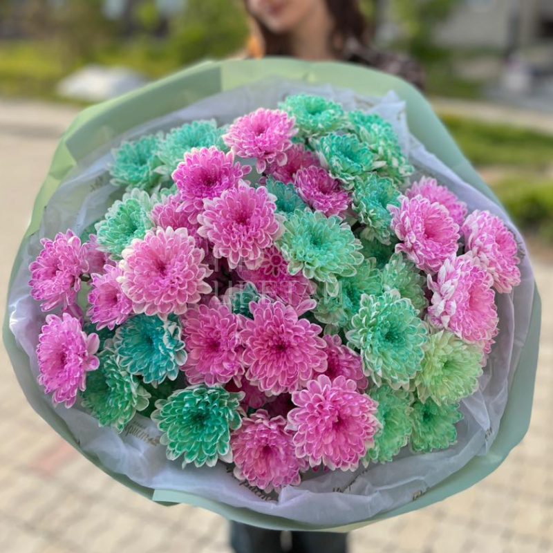 Яркий и очень пышный букет из зелено-розовых кустовых хризантем