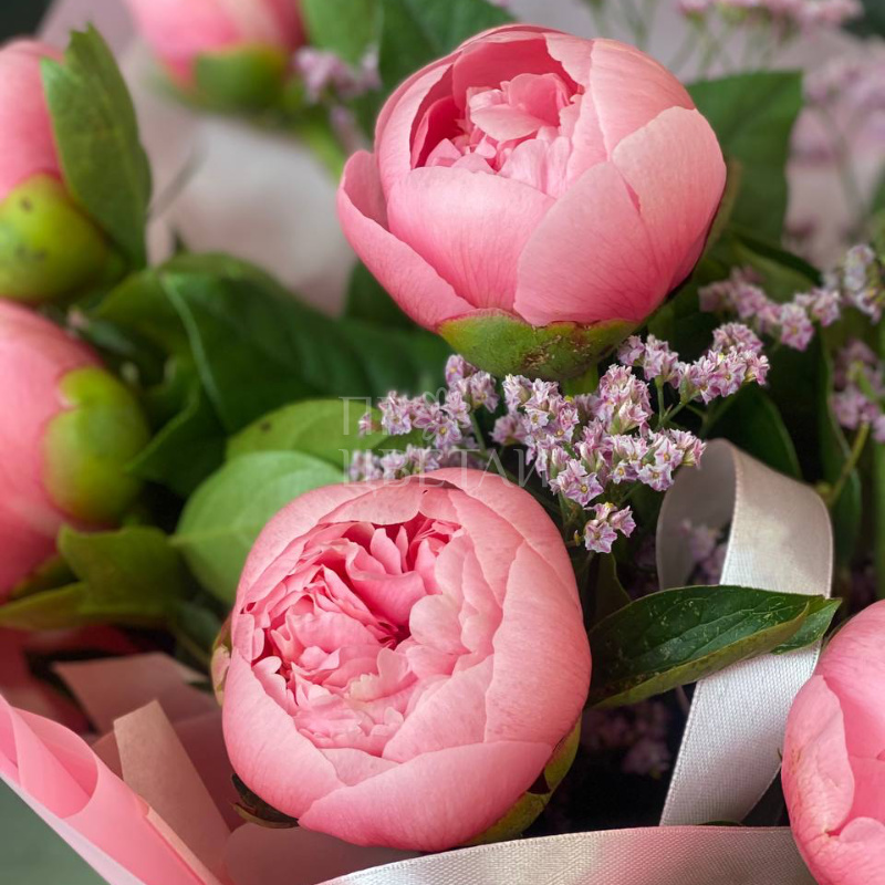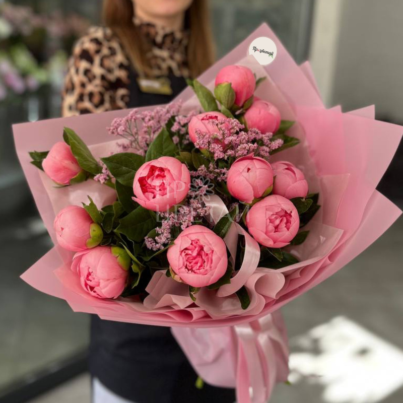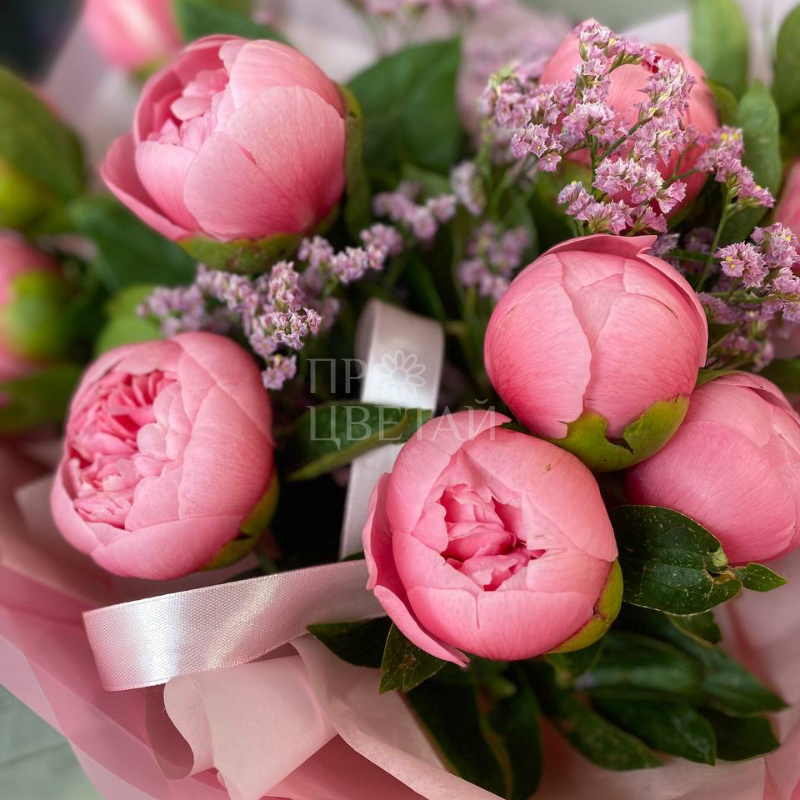 Монобукет из розовых пионов с добавлением лимониума смотрится изысканно и в то же время шикарно! Заказать букет можно с доставкой по Хабаровску.
