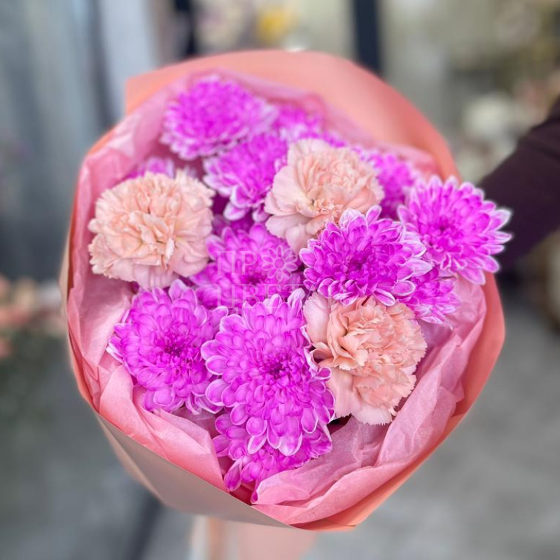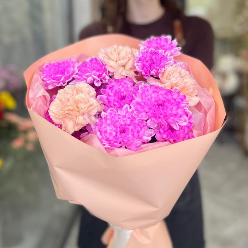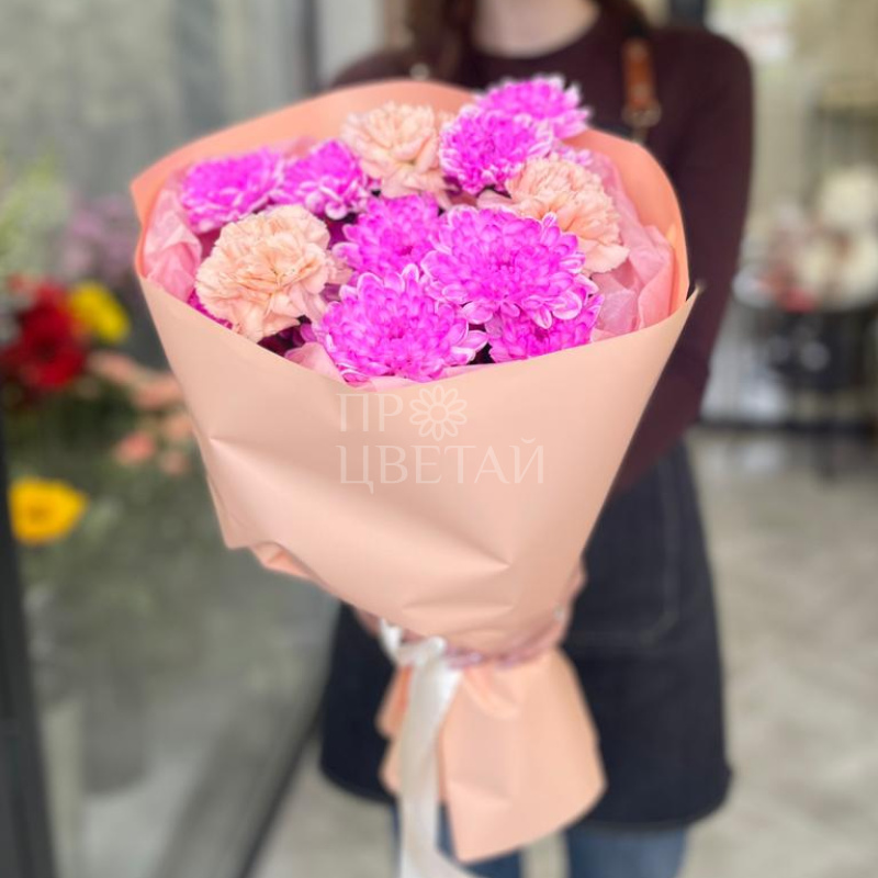 Сборный яркий букет из розовых хризантем и гвоздик