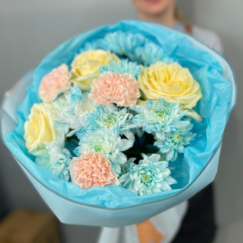 Нежный букет в голубых оттенках станет отличным презентом на любой праздник