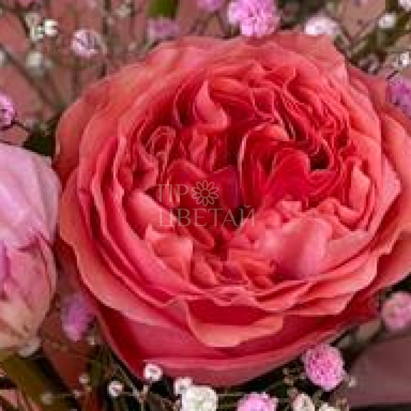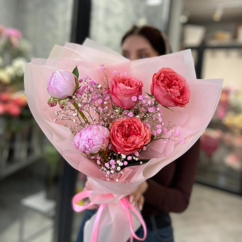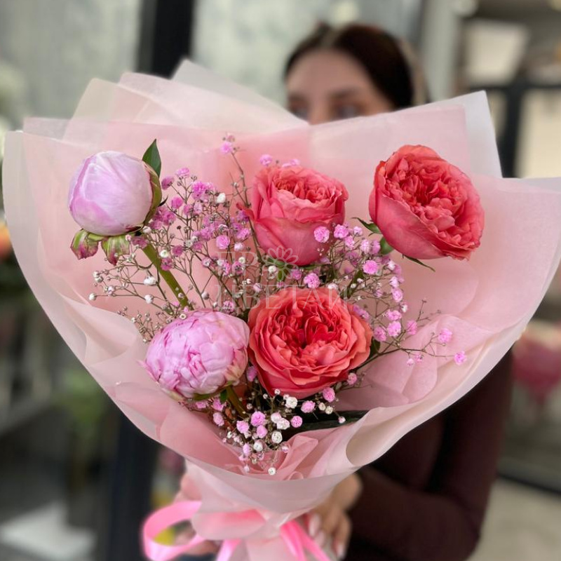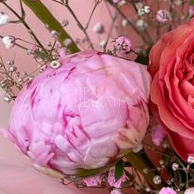 ароматный букетик из пионов и шикарных пионовидных роз с гипсофилой