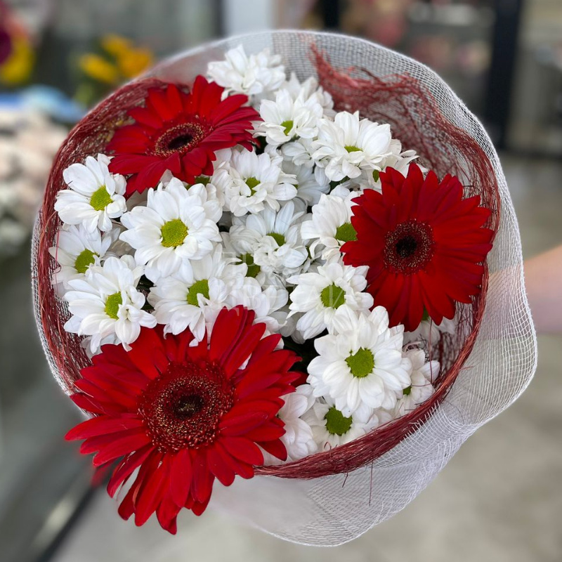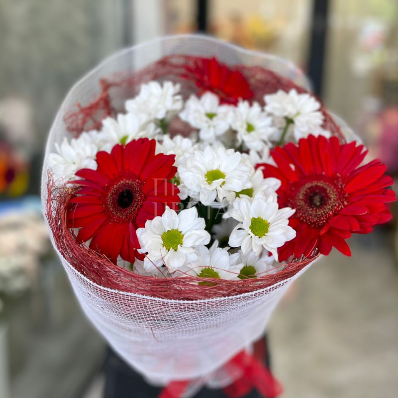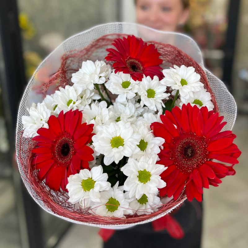 Этот яркий и жизнерадостный букет сочетает в себе насыщенные красные герберы и нежные ромашковые хризантемы, создавая гармонию цветов и эмоций. Красные герберы, символизирующие страсть и любовь, придают композиции динамичность и энергию. Их крупные, яркие лепестки привлекают внимание и наполняют пространство теплом.