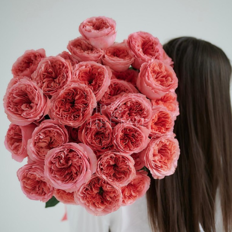 Сочные розы в ярком коралловом цвете, собранные в большом букете, напоминают о летних днях и солнечных моментах, принося радость и оптимизм.