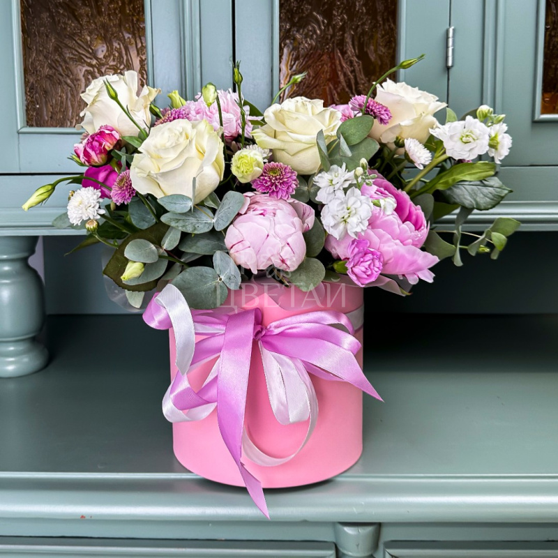 Аккуратная и в то же время слегка небрежная композиция в цилиндрической коробке покорит сердце получателя.
