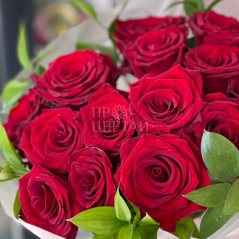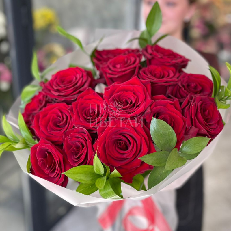 Классический букет из насыщенных красных и очень стойких роз с добавлением зелени-рускуса